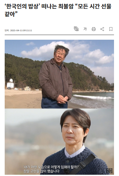 최불암은 "돌아보니 저에게도 모든 순간이 선물 같은 시간이었다"며 14년간 함께해온 시청자들에게 감사의 마음을 전했습니다. 그의 따뜻하고 진솔한 모습은 시청자들에게 깊은 감동을 선사했습니다.