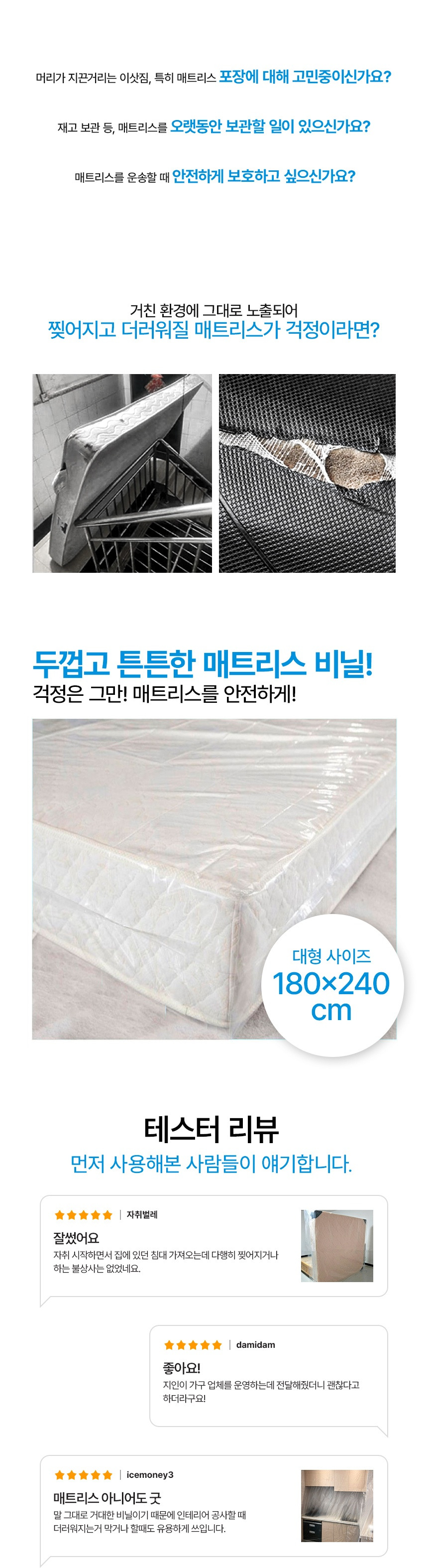 안녕하세요, 여러분! 오늘은 제가 최근에 발견한 정말 유용한 아이템에 대해 이야기해보려고 해요. 매트리스 보호가 이렇게 중요하다는 걸 그동안 잘 몰랐는데, 여러분도 아시죠? 비 오는 날 매트리스를 걱정하는 제 마음을 이해해주실 거라 생각해요. 다양한 오염물질이나 자칫 눕거나 앉았을 때 엉뚱한 곳에 긁힘이 생길까봐 불안했거든요. 그런 저에게 이 가구 침대 매트리스 포장 비닐 커버는 정말 큰 도움이 되었습니다!